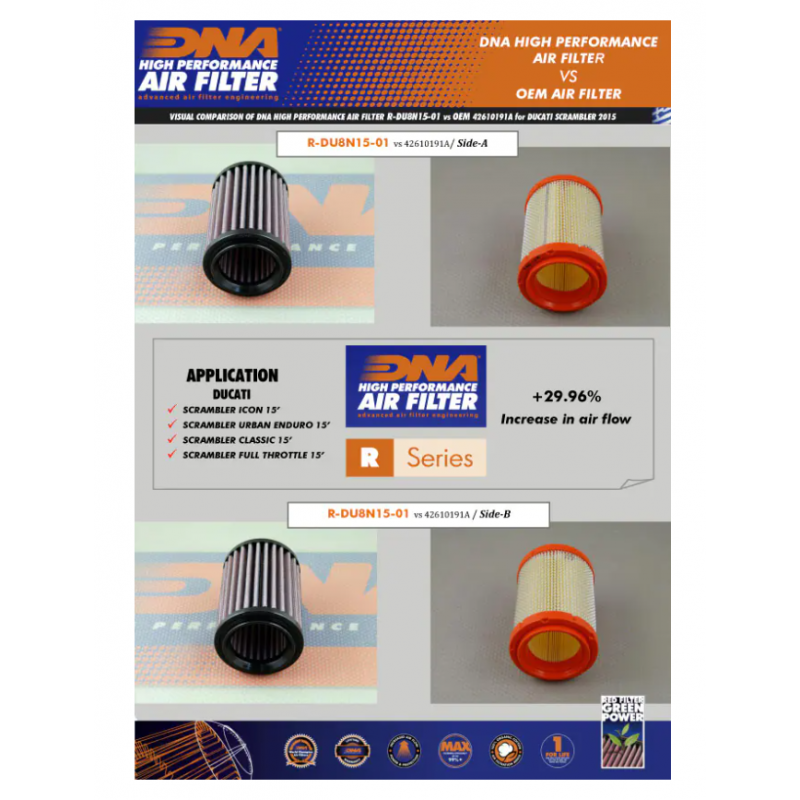 Filtrul de aer sport DNA, reutilizabil și proiectat ca înlocuitor al filtrului original, este creat pentru a crește puterea și accelerația motocicletei, oferind în același timp o filtrare excelentă. Aceste filtre se pot spăla, curăța și unge, fiind folosite din nou și din nou. Cu o formă și un design perfect compatibil cu cutia originală a filtrului, instalarea este simplă și oferă o îmbunătățire imediată a performanței motocicletei.