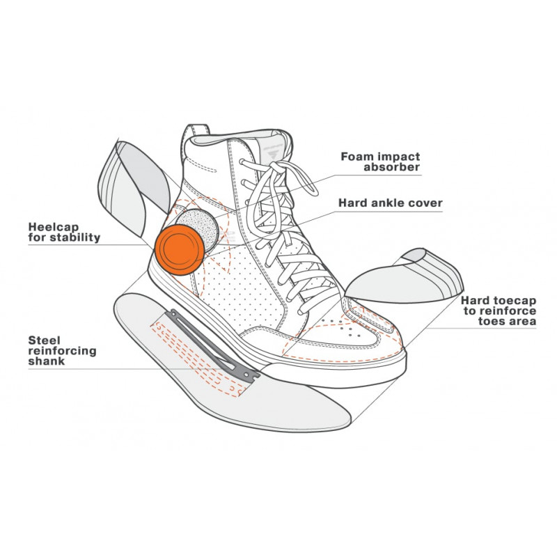 - Protecție sporită – zone ranforsate și întărite în zona călcâiului, a degetelor și a gleznei pentru un nivel mai ridicat de siguranță.