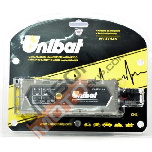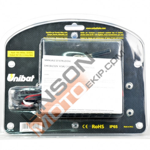 Încărcător automatic CH4 (6V/12V 4.5A) Acest produs este proiectat pentru a încărca și întreține bateriile cu 6 sau 12 volți cu acid plumb. Încărcătorul este optimizat pentru a menține bateria motocicletei sau a mașinii în cazurile în care nu este utilizat pentru perioade îndelungate de timp, cum ar fi iarna. Încărcătorul este complet automat cu un ciclu de încărcare în 6 etape. Este proiectat pentru a încărca gel, AGM și baterii standard cu plumb. SPECIFICAȚII: Tensiune de funcționare: 100-240V ~ 50/60 Hz Tensiune de încărcare: 7.2V sau 14,4 V sau 14,7 (+/- 0,25V) Curent de încărcare: Max. 4.5A (regim de vară și de iarnă) Max. Tipuri de baterii 1A (Motocicletă): Toate bateriile cu plumb cu 6V sau 12V (SLA, AGM, GEL) Capacitate de încărcare: 1.2 - 120Ah Capacitate în modul suport: 1.2 - 150Ah