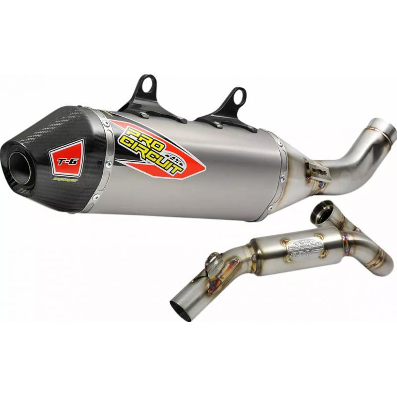 Sistemul de evacuare din oțel inoxidabil T-6 oferă aceleași beneficii ca și sistemul de evacuare din titan Ti-6, dar T-6 este construit din oțel inoxidabil și aluminiu pentru rezistență și durabilitate sporite, oferind în același timp piloților o alternativă mai accesibilă la titan; Este prevăzut cu un amortizor de scântei detașabil, facilitând trecerea de la pilotajul off-road la cel de interior